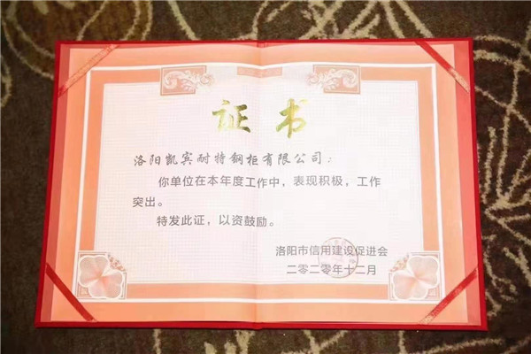 在洛陽市信用建設促進會屆第三次會員代表大會中,洛陽凱賓耐特鋼柜有限公司受到表彰,榮獲證書。
