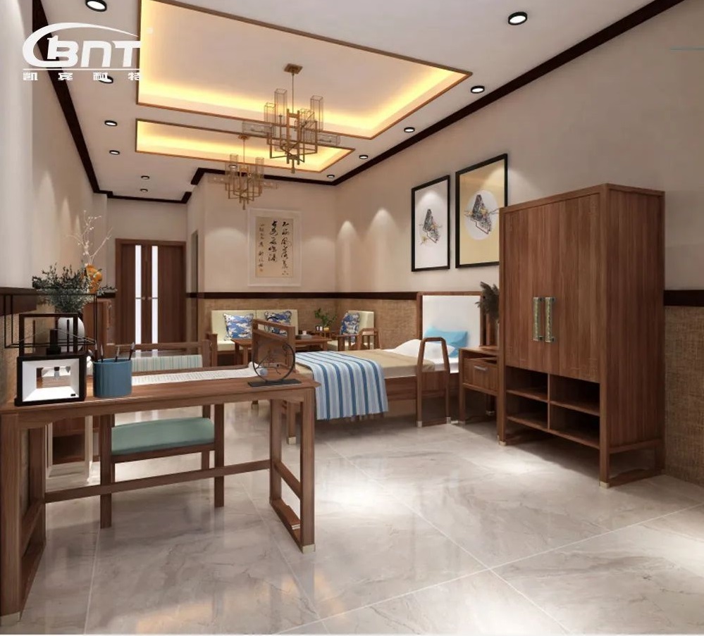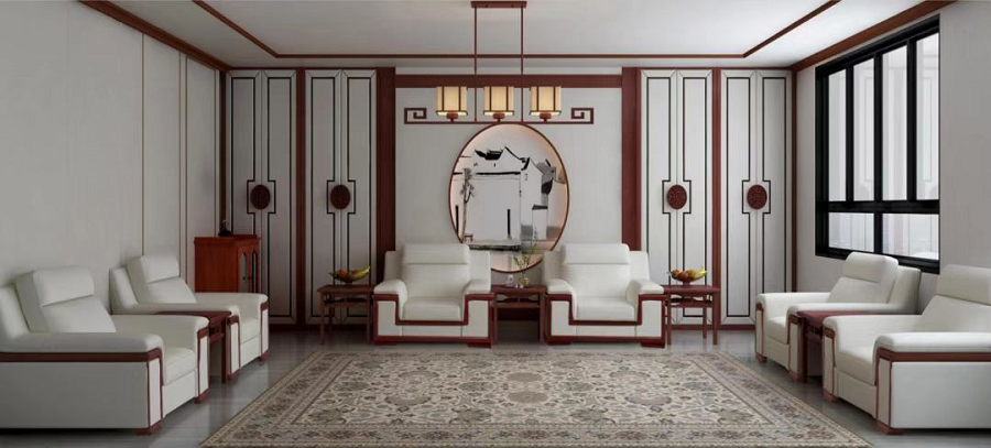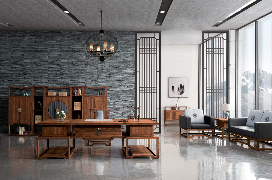 中式風(fēng)格:新中式東方美學(xué),刪繁就簡、古色古香,班臺、壁柜、茶臺、接待區(qū)