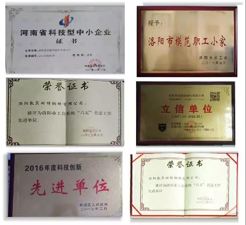 2014年取得ISO9001質(zhì)量管理體系、ISO14001環(huán)境管理體系 、OHSAS18001職業(yè)健康安全管理體系三大管理體系認(rèn)證,同年獲得河南省科技廳頒發(fā)的“科技型中小企業(yè)”,市科技局頒發(fā)的“市級企業(yè)研發(fā)中心”;2015年市工信委頒發(fā)“隱形企業(yè)”、“民營企業(yè)”,市科技局頒發(fā)“科技小巨人培育企業(yè)”,市總工會頒發(fā)“五一勞動獎狀”、“和諧勞動關(guān)系模范單位”;2016年洛陽市總工會頒發(fā)“六五普法工作先進(jìn)單位”;2017年老城區(qū)政府頒發(fā)“科技創(chuàng)新先進(jìn)單位”,洛陽市總工會頒發(fā)“模范職工小家”,同年通過綠盾企業(yè)征信系統(tǒng)認(rèn)證,中國環(huán)境標(biāo)志產(chǎn)品認(rèn)證;2019年獲得兩化融合管理體系評定證書,以及近年來共獲得外觀設(shè)計(jì)和實(shí)用新型33項(xiàng)。